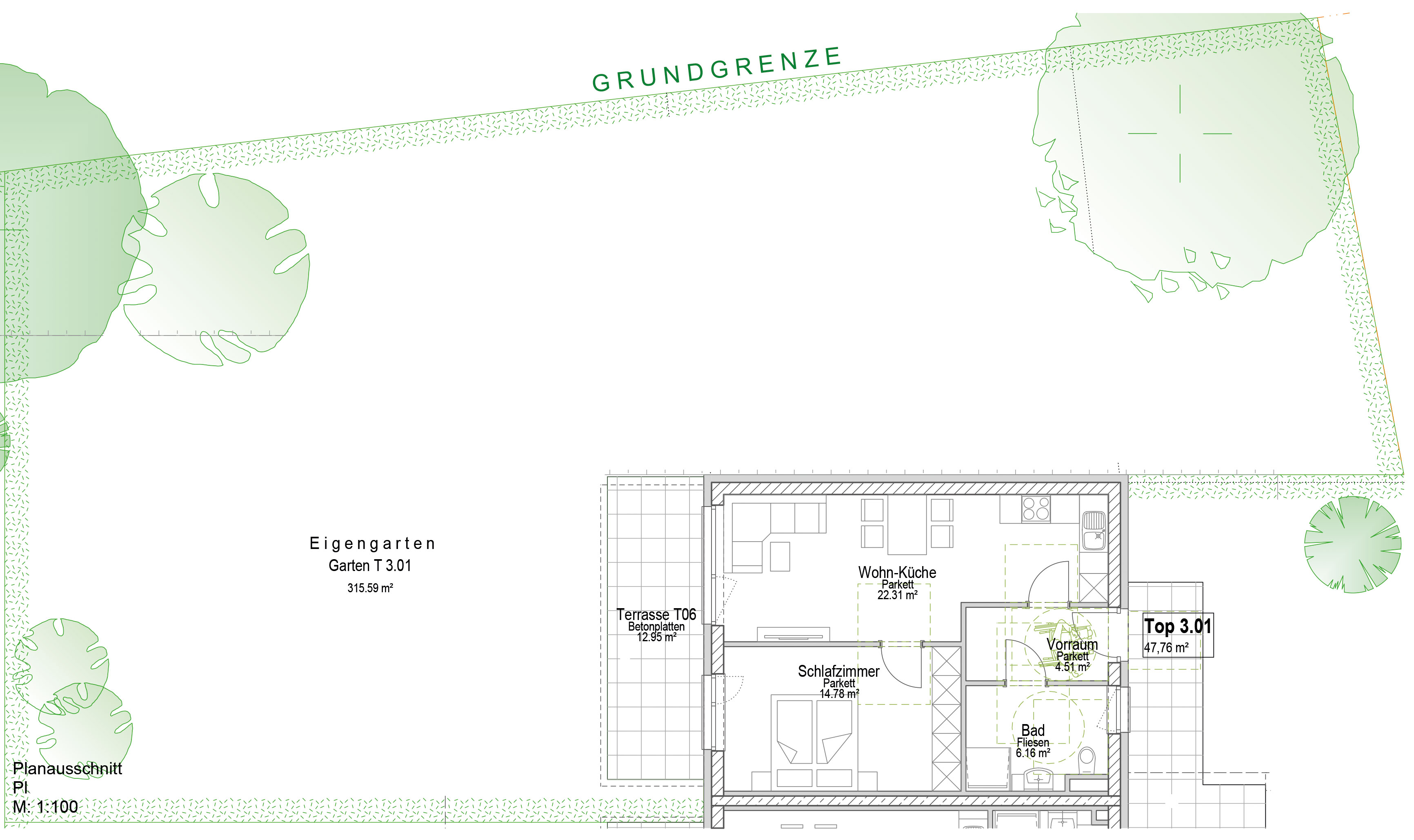 Diese Wohnung besticht durch einen offen gestalteten Wohn- und Essbereich, der direkt auf die Terrasse führt. Der außergewöhnlich weitläufige Garten bietet grenzenlose Freiheit im Freien. Ein gemütliches Schlafzimmer und ein modernes Bad machen dieses Zuhause zu einer perfekten Rückzugsoase.