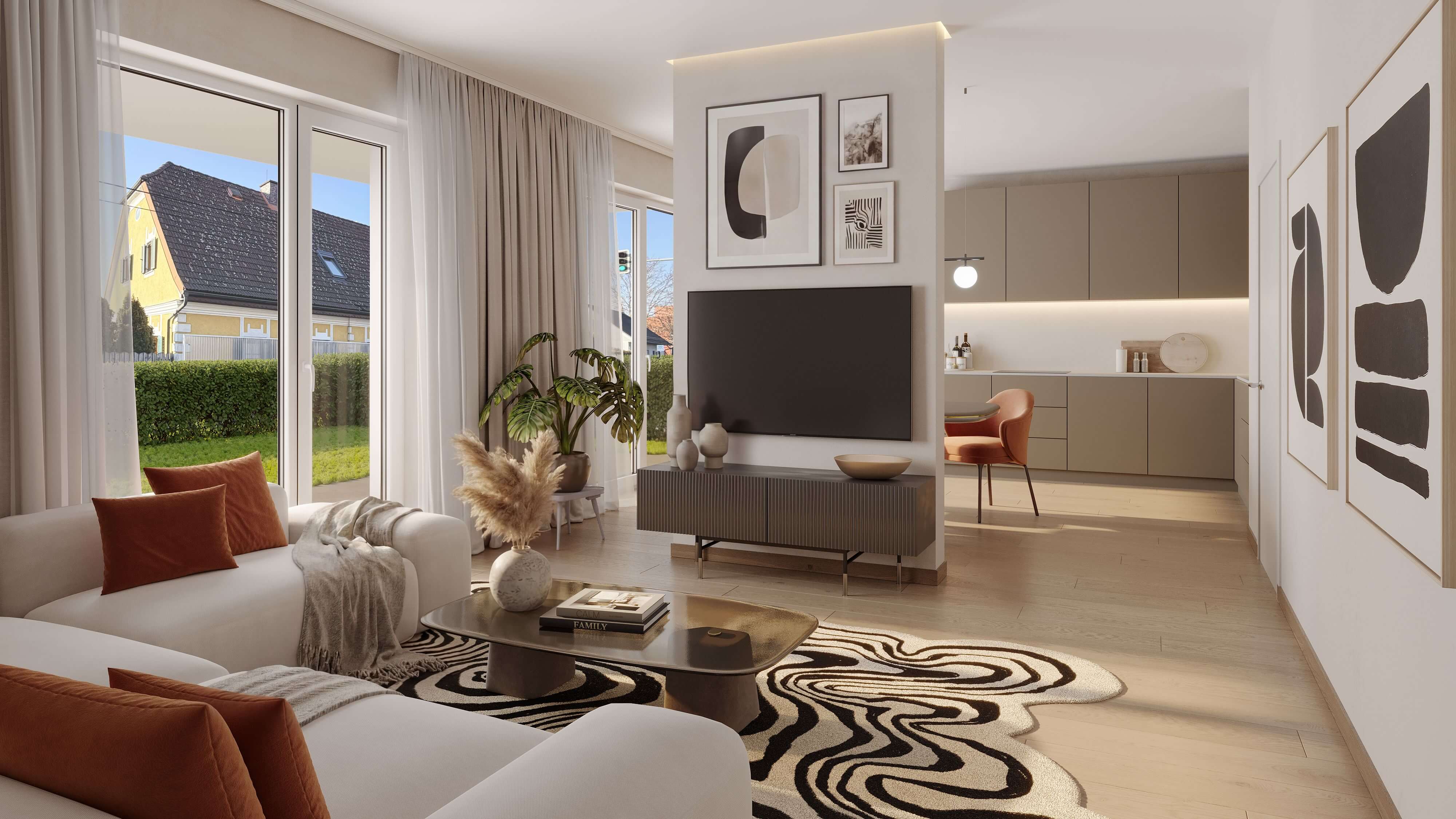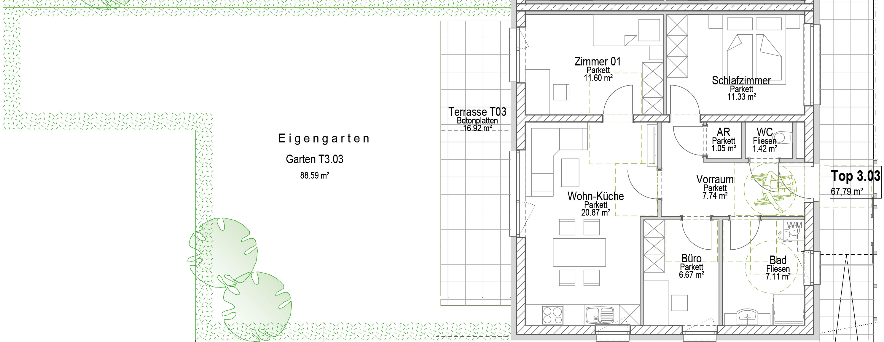 Diese Wohnung besticht durch eine intelligente Raumaufteilung mit separaten Schlafbereichen und einem zusätzlichen Arbeitszimmer. Der helle Wohn-Essbereich führt direkt auf die Terrasse und in den privaten Garten, während ein praktischer Abstellraum für zusätzliche Ordnung im Alltag sorgt.