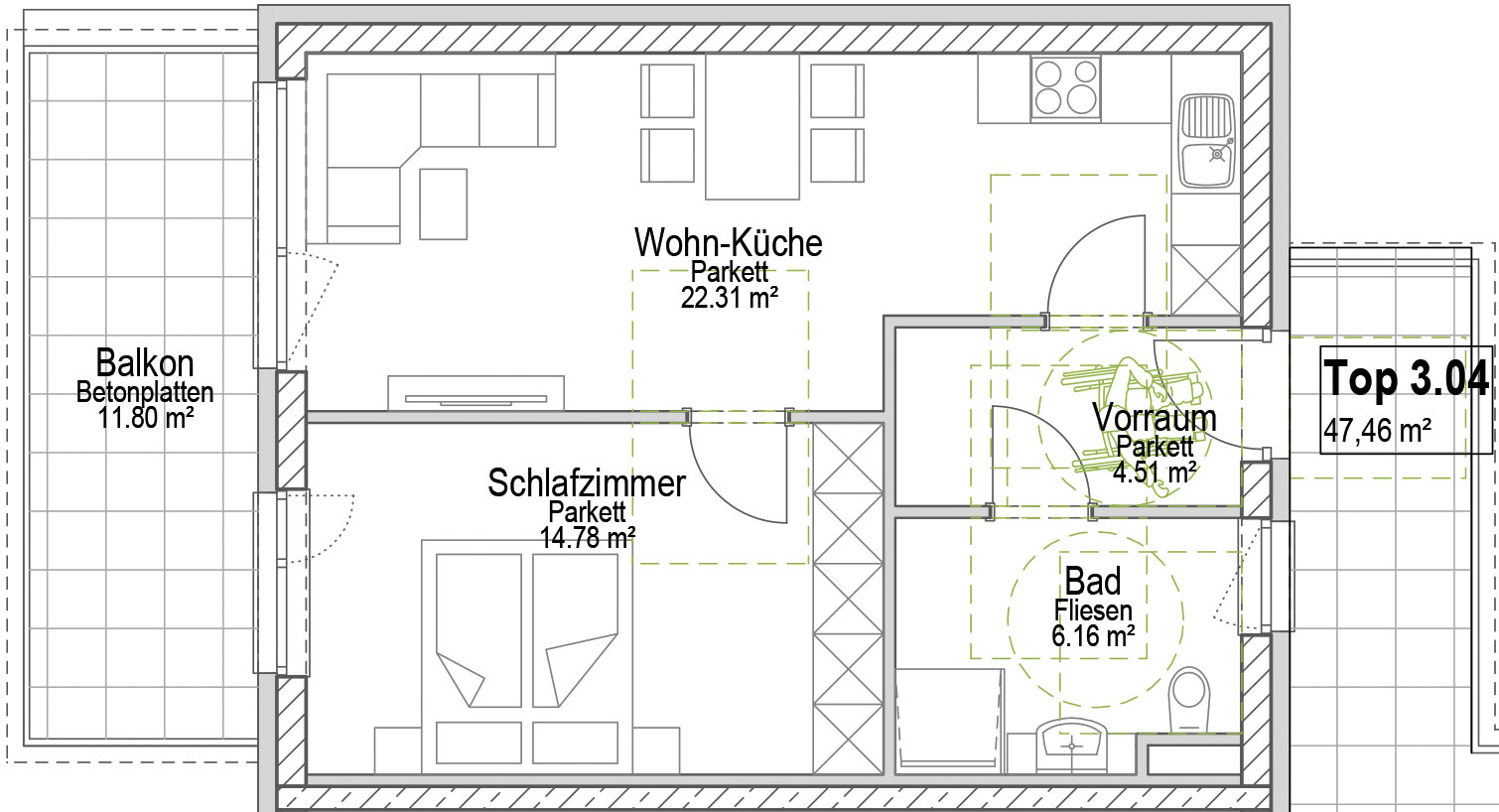 Ein einladender Wohnbereich bildet das Herzstück dieser Wohnung. Von hier aus gelangen Sie direkt auf den gemütlichen Balkon. Ein ruhiges Schlafzimmer sowie ein großzügiges Badezimmer ergänzen das durchdachte Raumangebot perfekt und schaffen eine behagliche Atmosphäre.